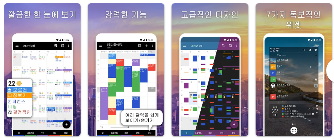일정 예약뿐만 아니라 할 일 목록과 리마인더 기능을 통합하여 달력 이상의 역할을 수행합니다. 맞춤형 위젯을 통해 스마트폰 홈 화면에서도 편리하게 일정을 편집하고 확인할 수 있습니다.
