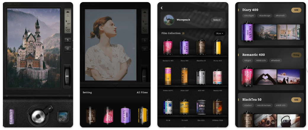 다양한 가상 필름 팩을 제공하며 각 필름은 고유의 색상, 입자, 빛샘 효과를 가집니다. 촬영된 사진은 필름별로 정리되어 나만의 디지털 보관함을 구성할 수 있습니다.