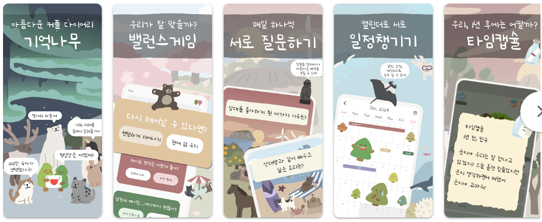 기록이 쌓일수록 가상의 나무가 자라나는 시각적 재미를 주며 다이어리 외에도 게임과 타로 등 즐길 거리를 포함합니다. 단순 기록을 넘어 연인 사이의 관계를 돈독하게 만드는 감성 콘텐츠 중심의 커플 플랫폼입니다.