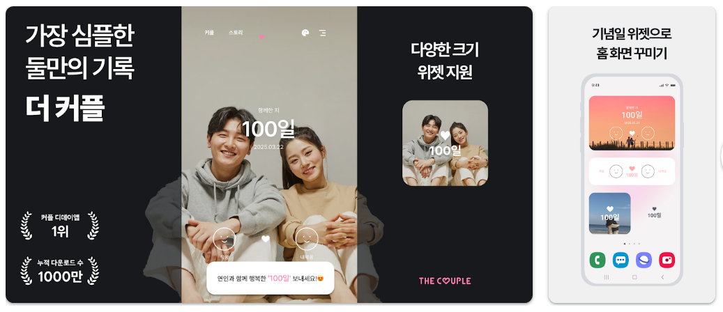 앱 내에서는 커플만의 프로필을 꾸밀 수 있으며 위젯 기능을 통해 스마트폰 배경화면에서 실시간으로 기념일을 확인합니다. 깔끔한 인터페이스와 스토리 기능을 통해 연애 기록을 체계적으로 보관할 수 있는 공간을 제공합니다.