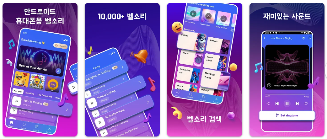 이러한 벨소리 설정 앱들은 방대한 라이브러리와 편리한 편집 기능을 제공합니다. 최신 가요부터 클래식, 독특한 알림음까지 선택의 폭이 매우 넓으며, 상황에 맞춰 기기 분위기를 즉각적으로 바꿀 수 있습니다.