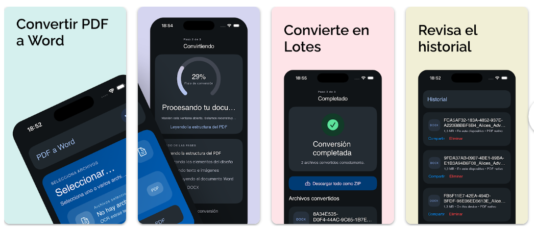 Enzipe에서 출시한 이 앱은 PDF를 편집 가능한 DOC 및 DOCX로 바꾸는 강력한 성능을 자랑합니다. 단순한 텍스트 추출을 넘어 문맥과 서식의 흐름을 지능적으로 보존하는 기술이 적용되었습니다.