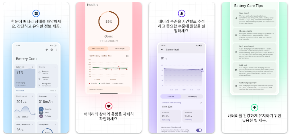 - "Battery Guru 충전 알람 덕분에 밤새 꽂아두지 않고 적정 수준에서 멈추는 습관이 생겼습니다."
