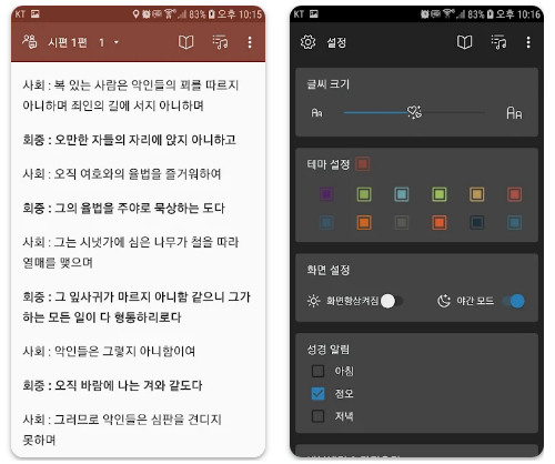 - 가로 모드에서 두 가지 성경을 동시에 비교 가능