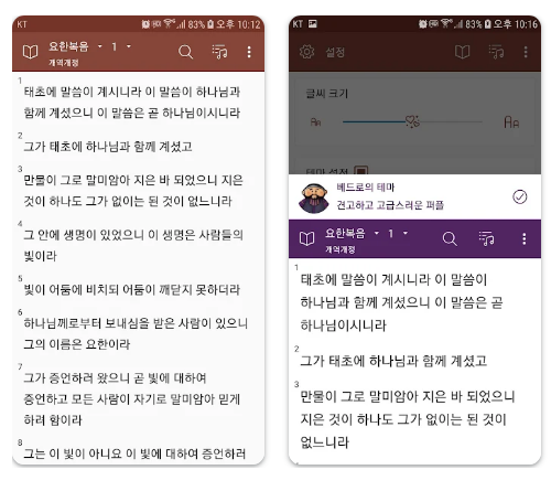가로 모드를 활용하면 두 가지 성경 번역본을 동시에 비교하여 확인할 수 있습니다.
